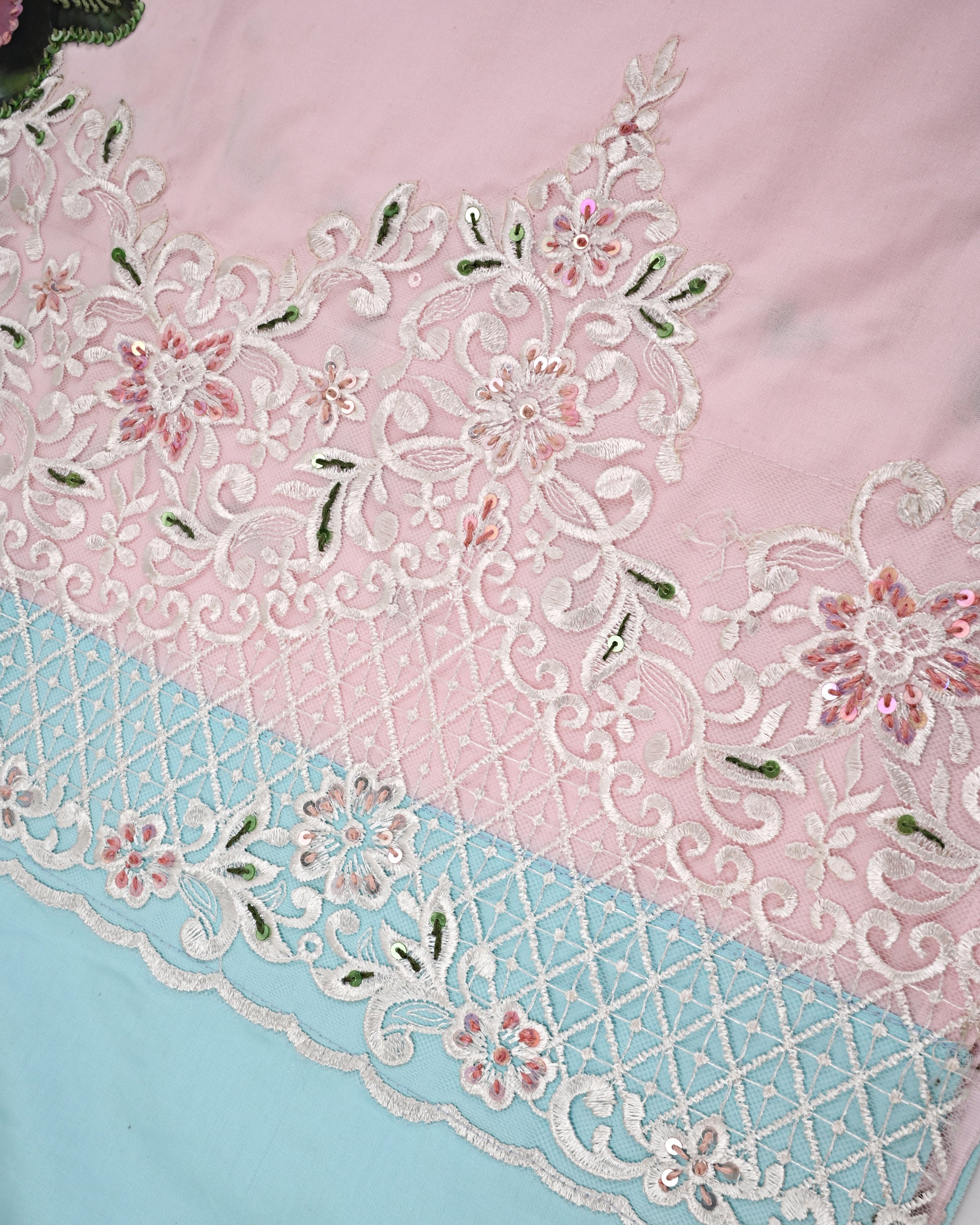 Baby Pink Rida With Smart Lace Panal & Floral Applique With Aari TouchUp