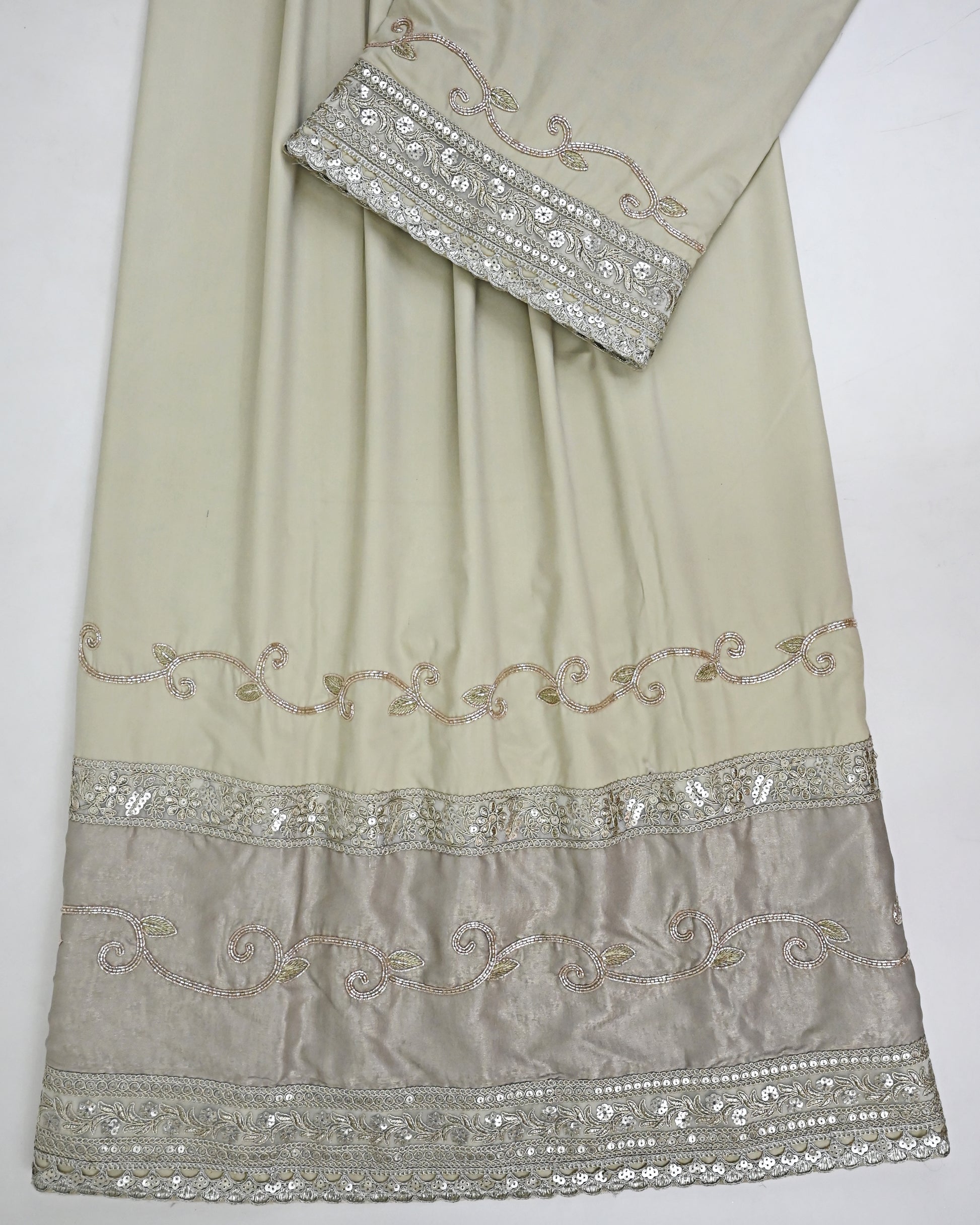 Light Beige Rida With Heavy Look Golden Lace & Aari Work All Over Border On Panel