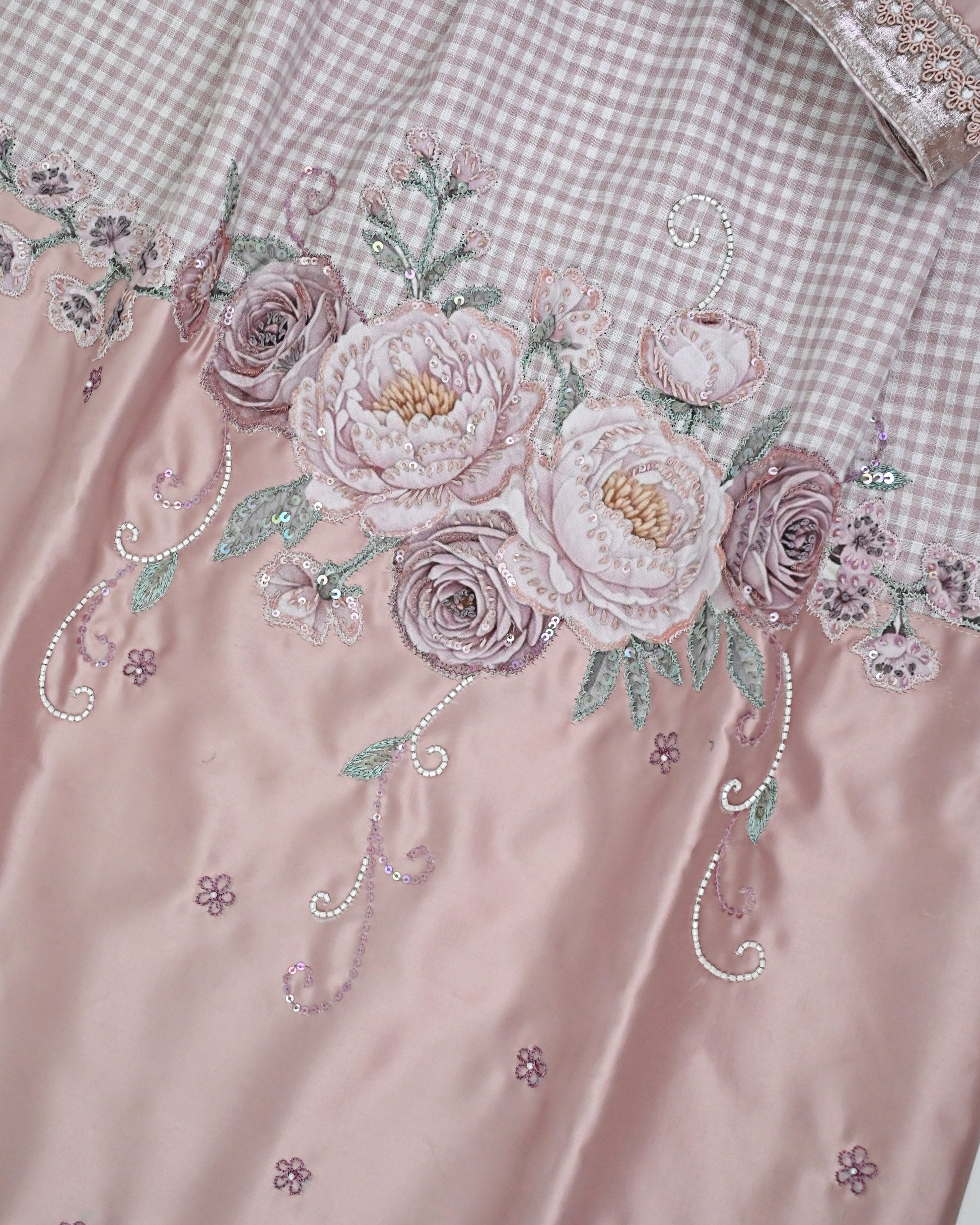 Mauve Checks Heavy Look Rida With Shining Panel Floral Aari Work