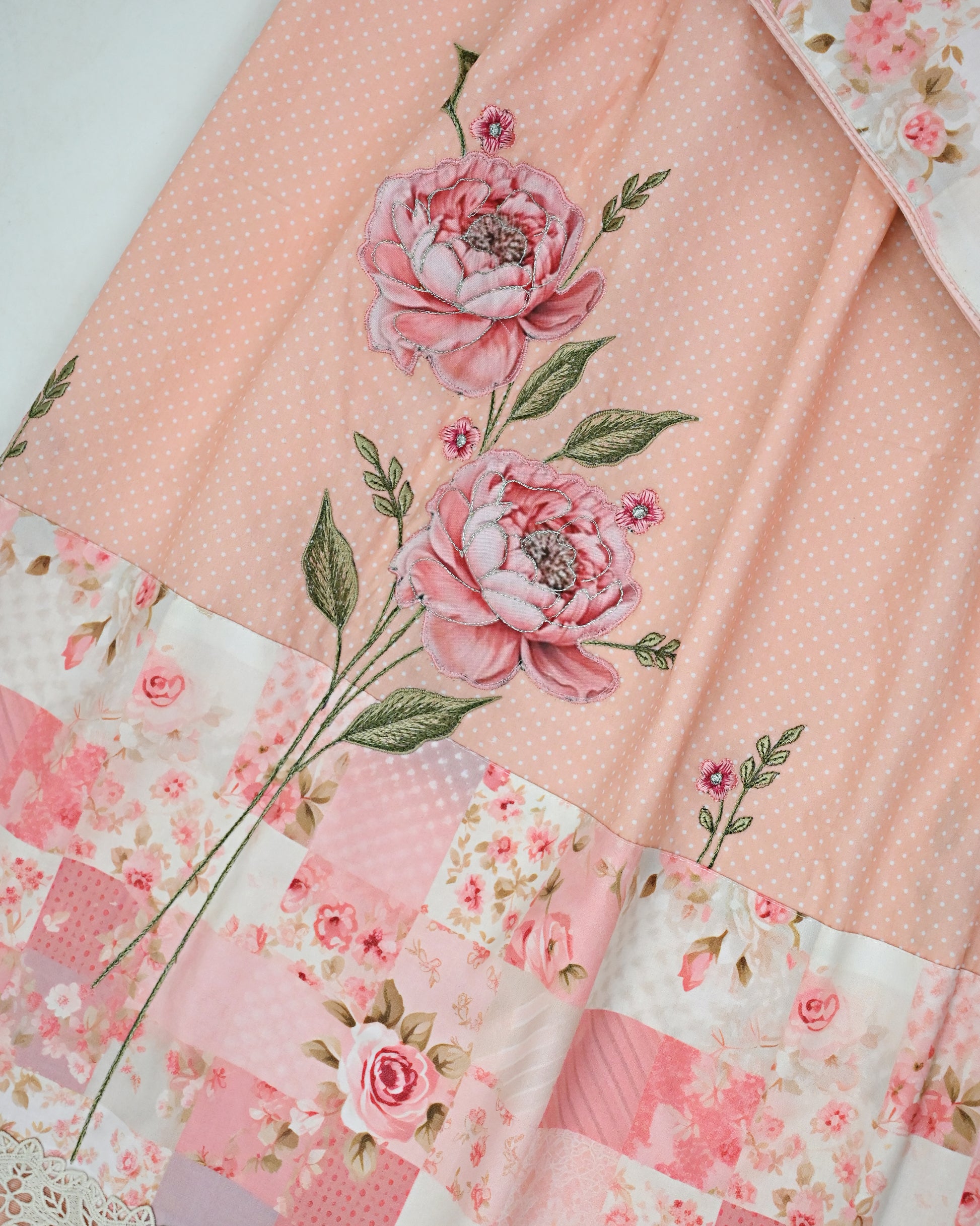 Light Peach White Polka Dots Rida With Smart Lace & Beautiful Design Panel Floral Work