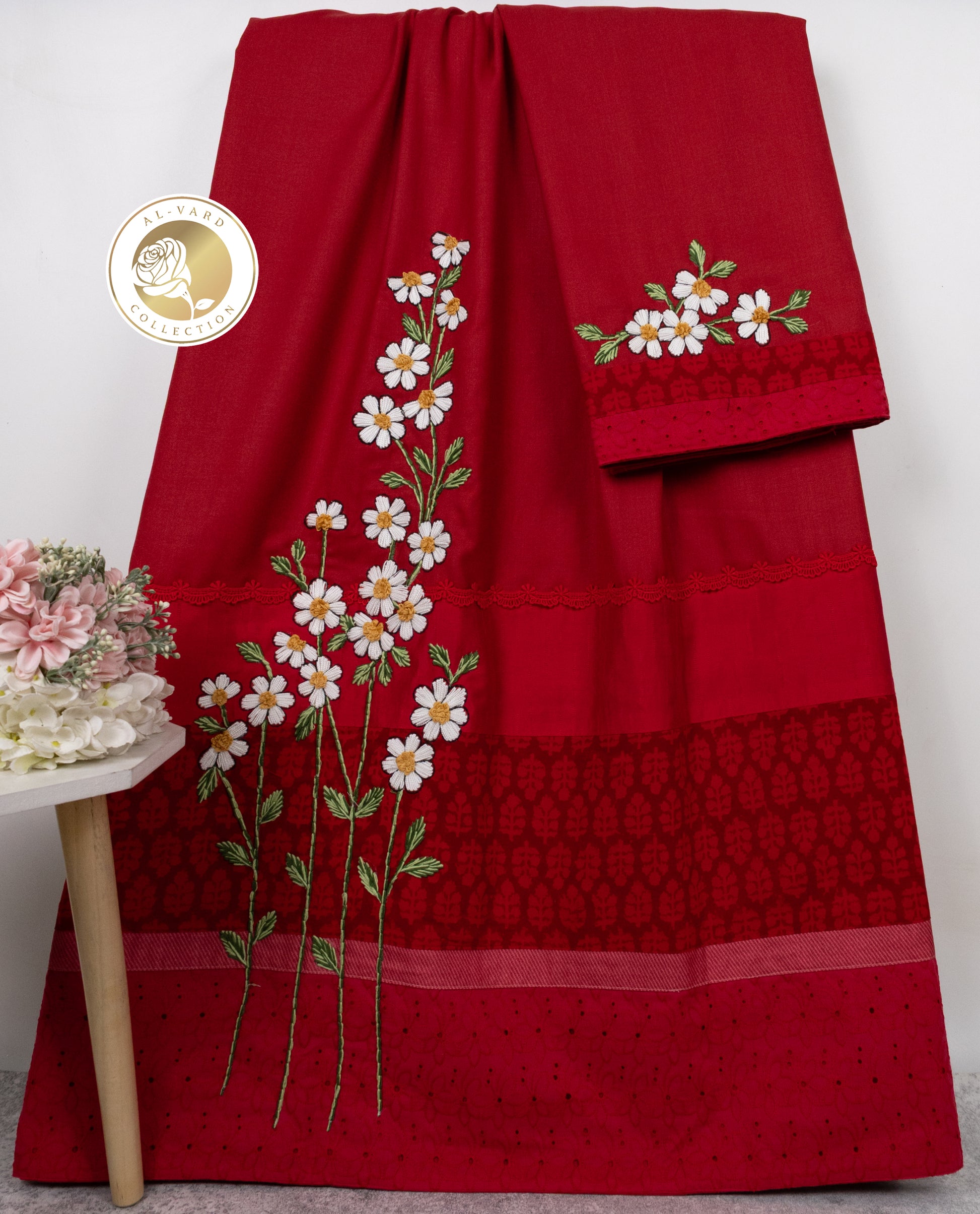 Deep Red Rida With Smart Red Batik Panel Hakoba Lace & White Floral Work