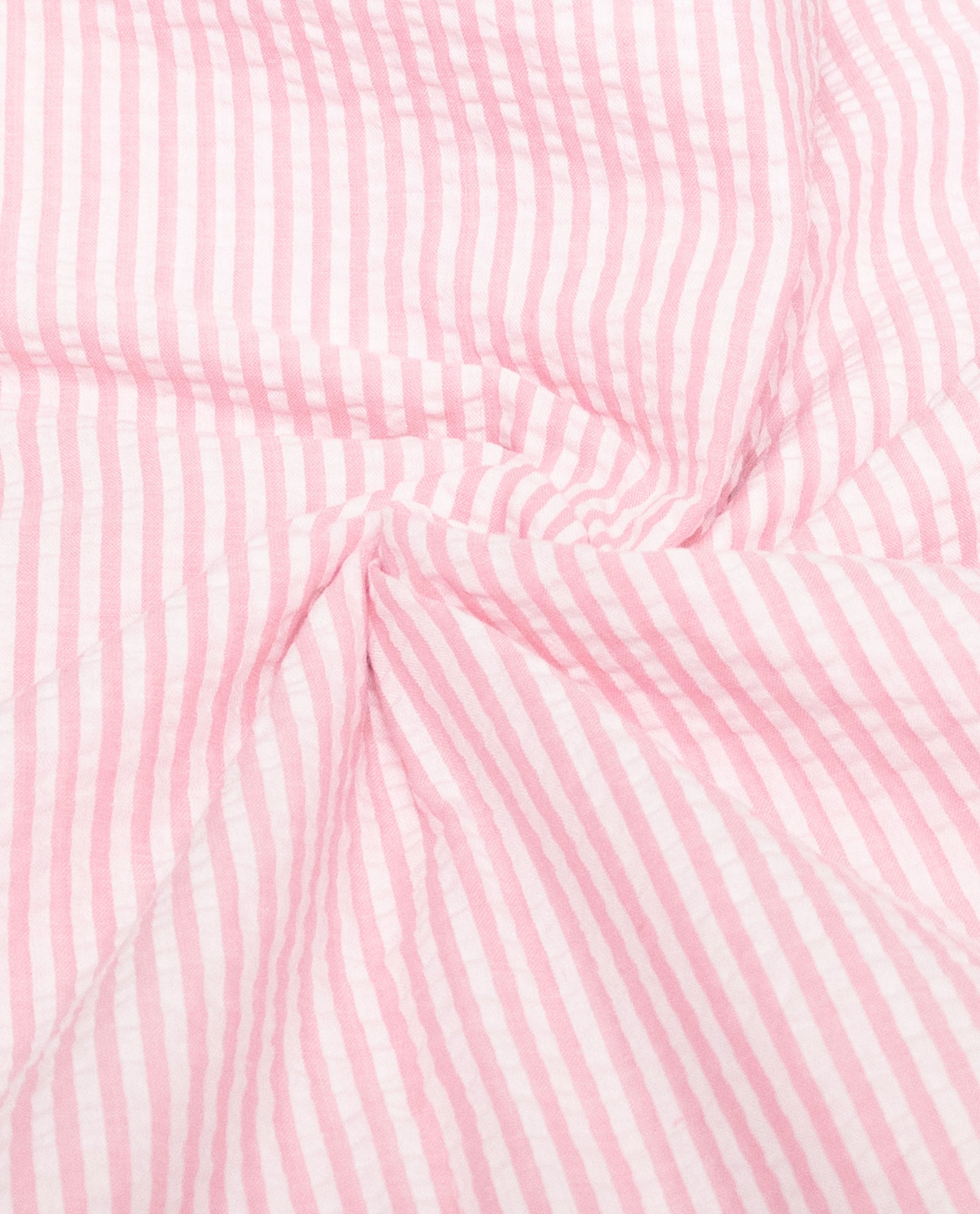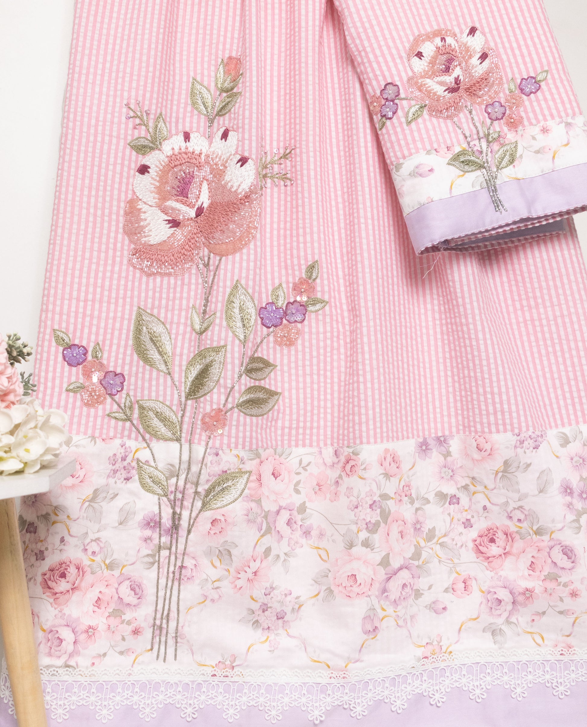 White & Pink Stripes Popcorn Rida With Floral Panel & Floral Aari Work