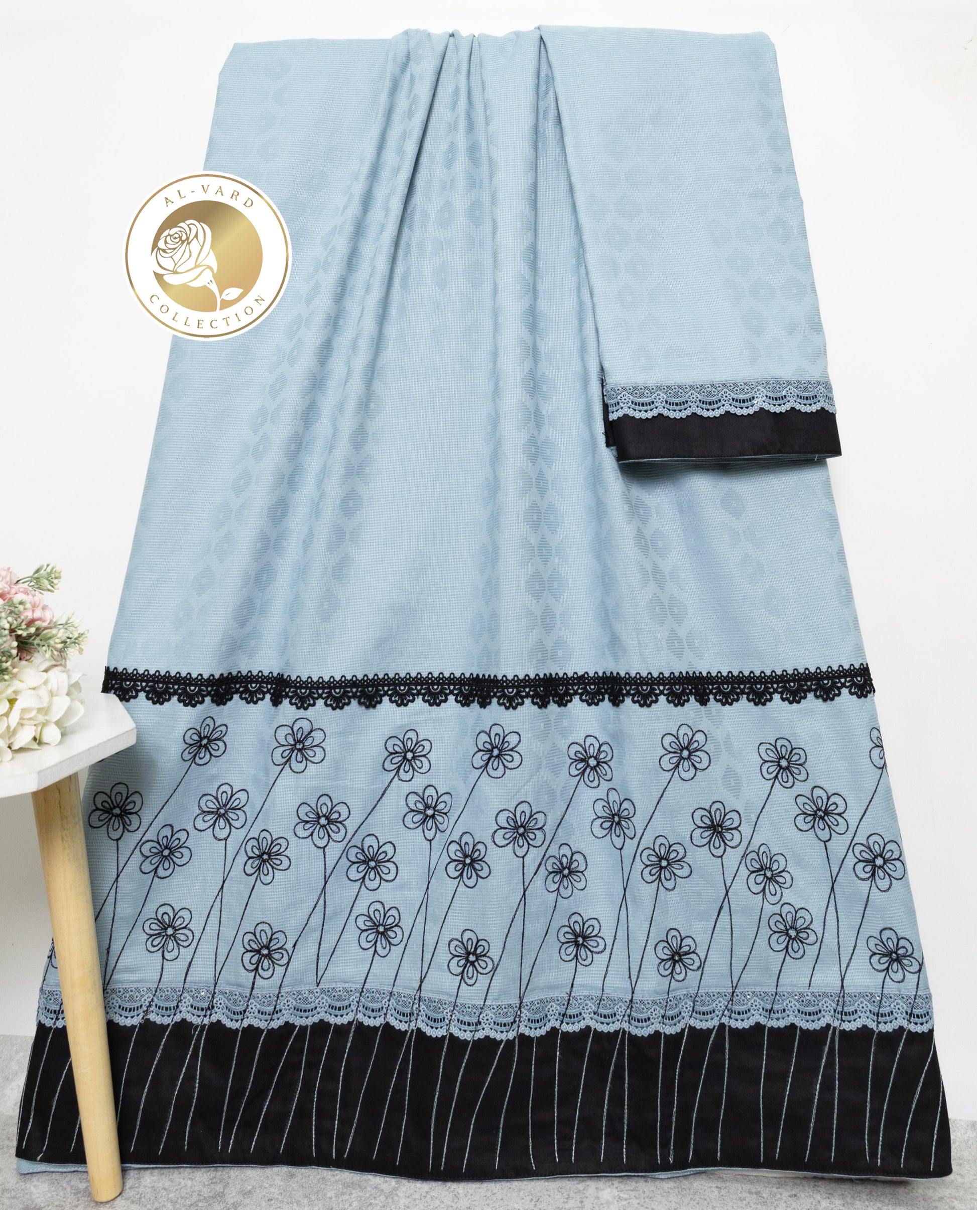 Light Blue Self Design Rida With Black Panel Lace & Floral Embroidery